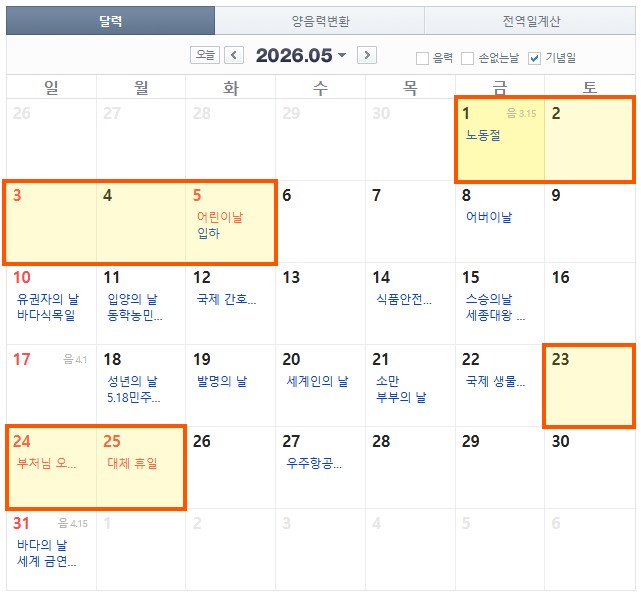 - 5월 황금기: 5월 23일(토) ~ 5월 25일(월), 26일 연차 시 27일까지 5일
