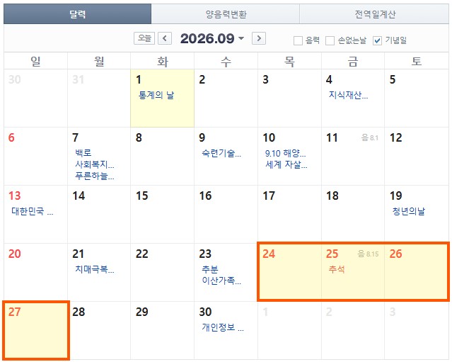 - 추석 연휴: 9월 24일(목) ~ 9월 27일(일), 총 4일